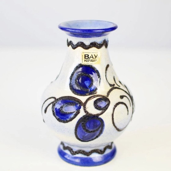 West Germany vase by Bay, made in the 1970s. The vase is white and has an organic blue pattern with a fat lava edge. Marked 66-14.