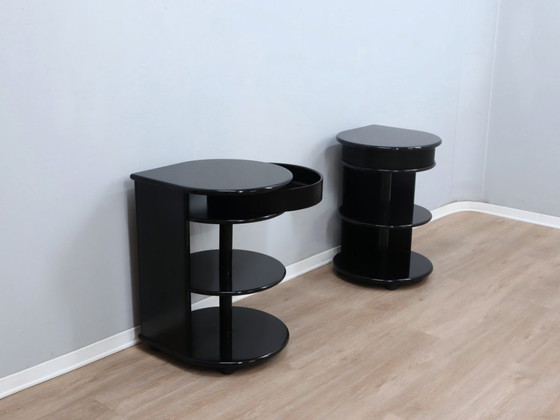 Step into the bold aesthetic of the early 1980s with this striking pair of nightstands production attr. to B&B, a tribute to the sophisticated minimalism popularized by Kazuhide Takahama and the high-end Gavina productions of the era.These pieces are defined by their sleek, black lacquered wood finish and a silhouette that balances geometric precision with functional surprise. The standout feature is the ingenious ABS plastic drawer, which features a distinctive slatted front and a seamless rotational opening mechanism that disappears into the frame when closed.