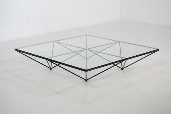 Square coffee table by the famous Italian designer Paolo Piva from the 70’s, edited by B&B Italia, Alanda model. It is composed of a glass top (thickness 1 cm) and a black lacquered tubular metal base (original paint).