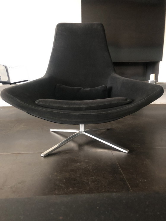 This design classic, designed by Jeffrey Bernett, is upholstered in elegant black fabric and stands on a stylish metal swivel base. The armchair is in excellent condition and offers a timeless addition to any interior. Includes a matching lumbar cushion.