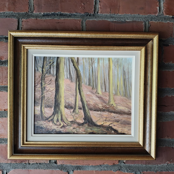 Keywords: Belgian art, vintage painting, forest painting, Daniel Pierot, woodland art, antique frame, rustic interior, midcentury decor, moody landscape, European art, Sonian Forest, oil painting