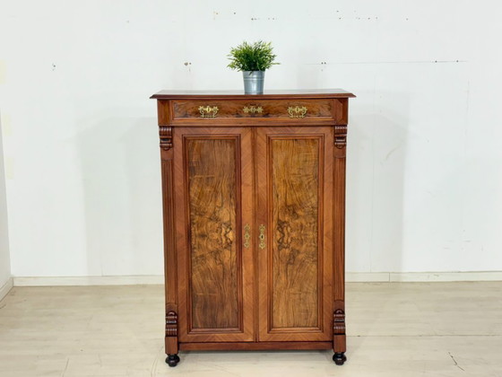 For sale is a magnificent Gründerzeit-era (circa 1900) cabinet. This piece of furniture is distinguished by its characteristic brass handles and a particularly beautiful walnut wood grain. A stylish collector's item with plenty of character.