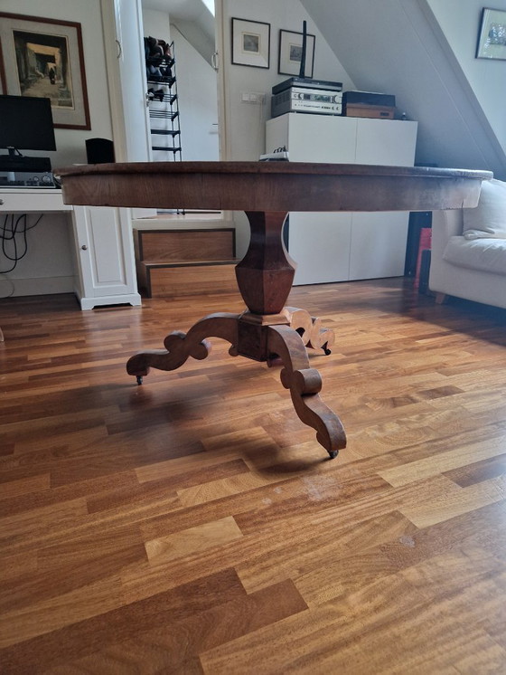 Beautiful antique Biedermeier table from 1848 for sale. Suitable for use as a dining table. The table has a round top, an elegant leg, and is made of oak.