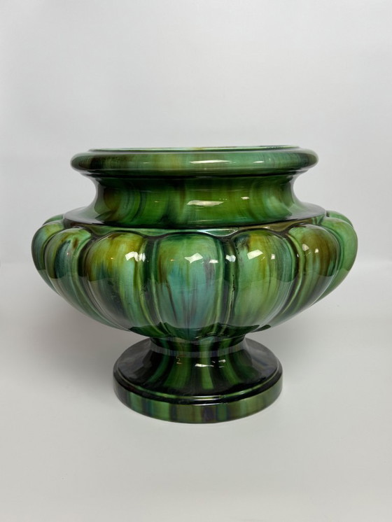 Beautiful Big Art Nouveau Majolica Jardiniere in High Gloss Green Tones. Elegant Art Nouveau majolica jardinière, Likely dating to around 1900. Made from heavy glazed earthenware with enamel decoration, showcasing organic lines and flowing forms characteristic of the Art Nouveau movement. Comparable examples are associated with renowned makers such as Julius Dressler, Minton and Delphin Massier. This is a particularly fine example, notable for its sculptural presence and decorative quality. Height: 31 Diameter Opening 24 Diameter Belly: 40 cm