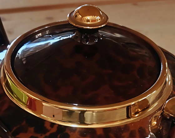 This beautiful ceramic teapot from Gibsons exudes the elegance of the Art Deco period. With its rich brown tones and refined gold accents, it's a real eye-catcher for any tea lover. Perfect for both everyday use and special occasions, this teapot adds a touch of vintage charm to your table. The typical 1930s tortoiseshell pattern is finished with gold leaf. In perfect condition!