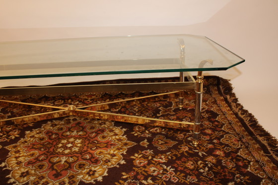 This refined French center table features an elegant brass and chrome frame with a stylish graphic design and chic details. The tabletop is made of very thick glass with faceted edges, creating a luxurious look.