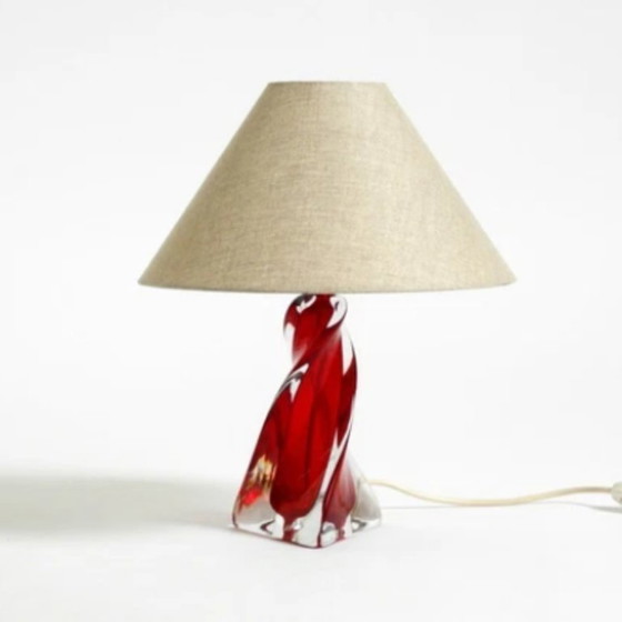 The lamp base is made of turned, solid crystal glass in red and clear.