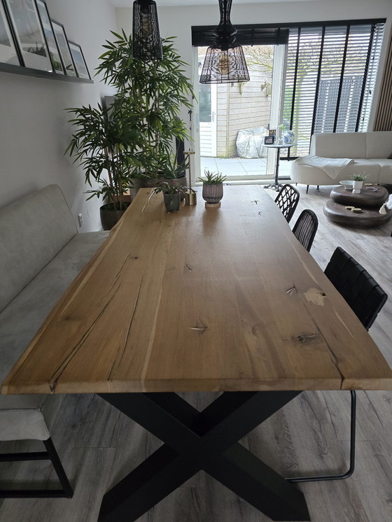 This beautiful tree trunk dining table is a real eye-catcher in your dining room. The solid 4cm-thick oak top exudes natural charm and provides a sturdy base for cozy dinners and long conversations. The table is 240cm long and 100cm wide, perfect for large gatherings. The black, powder-coated steel cross legs add a modern touch and provide sturdy support. Ideal for those who appreciate a natural style. Come to Gorinchem to pick up this unique table and give your interior a stylish upgrade!