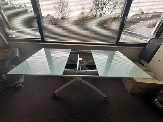 Beautiful glass coffee table from Ligne Roset. Industrial look. The table can be extended with an additional spacer.