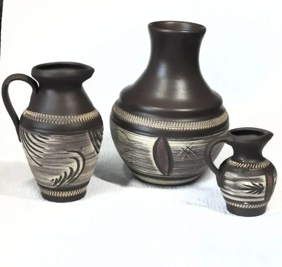 Bring a touch of mid-century modern magic into your home with this unique set of three handmade ceramic vases from the renowned Westerwald region!