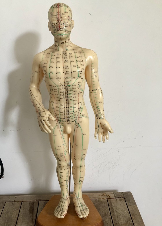 Brought back from China by grandpa in the 1960s; beautiful doll made of natural rubber (?) on wooden base with 4 caps. Across the body of the doll are acupuncture meridians in green and red. Meanwhile, the doll has a beautiful patina and is a fantastic decorative object. The doll is 50cm high and the wooden base is 18cm at its widest.