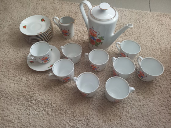 This beautiful vintage Kahla coffee set from the 1970s is a true eye-catcher for every coffee lover. With its elegant floral motif and subtle gold accents, this set adds a touch of nostalgia and sophistication to your coffee moments.