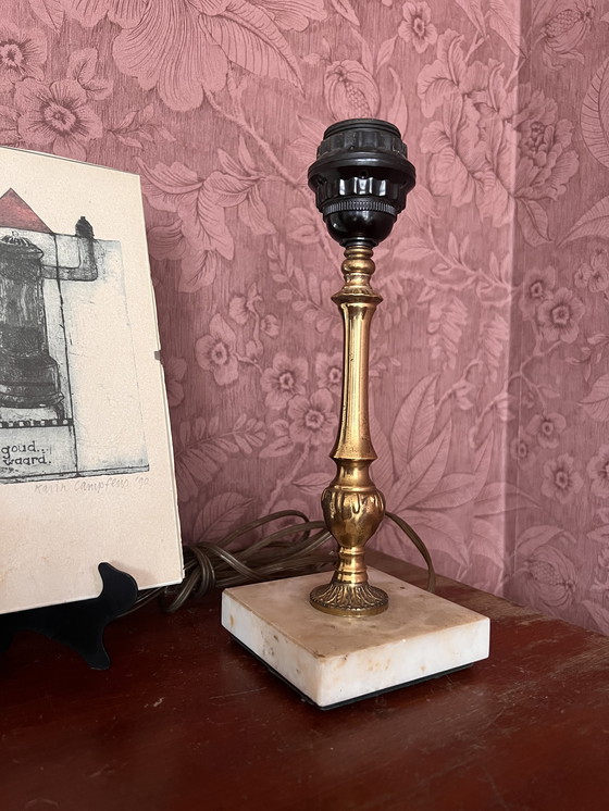 This is a charming vintage table lamp base, featuring a beautiful combination of metal and marble. The gold-tone metal stand is elegantly designed and rests on a sturdy marble base. Perfect for adding a touch of vintage elegance to any room, this lamp base is both functional and decorative. It carries the Joustra brand, known for quality craftsmanship.