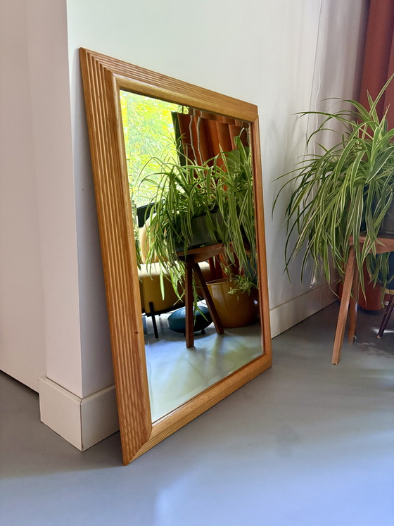 Beautiful large vintage pine mirror in very nice condition! The mirror has a Mid-Century Modern/Scandinavian look: organic/geometric and minimalist.