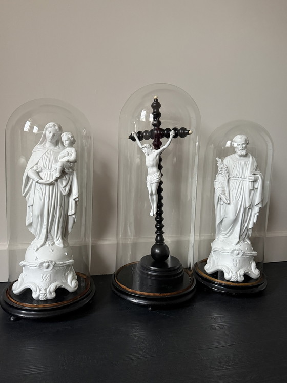 Kerkelijke beelden in stolp, origineel, uit oude kerk in Frankrijk. Enhance your decor with these stunning porcelain sculptures, each elegantly displayed under a glass dome. These pieces showcase intricate craftsmanship and timeless design, making them perfect for adding a sophisticated touch to any room. A true visual and cultural statement.