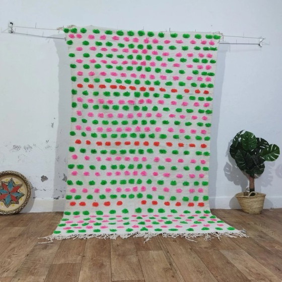 Step into a world of vibrant artistry with this exquisite Berber Artisan Rug, meticulously handcrafted from natural wool. Measuring 230 × 140 cm, this rug is a stunning example of traditional craftsmanship infused with a modern twist. Its lively pattern of green, pink, and orange dots against a pristine white backdrop creates a striking visual impact, perfect for adding a splash of color to any room.