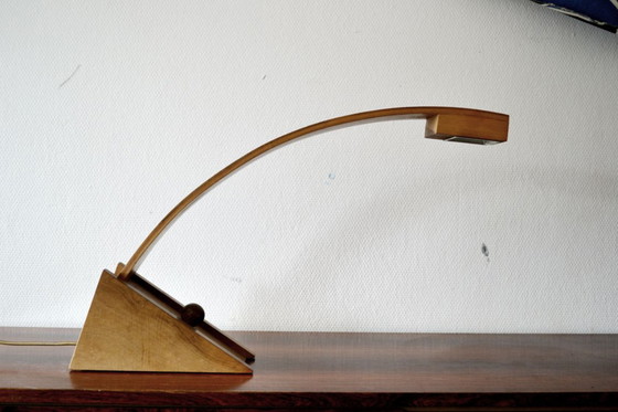 Wooden desk lamp by designer Bernard Brousse. This simple, lightweight, and elegant piece will add a touch of originality to your décor. In very good condition, with a dimmer switch. Bulb included.