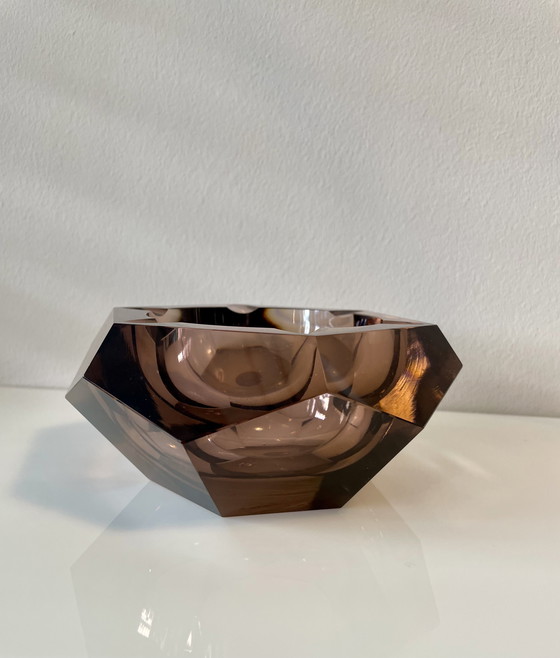 This exquisite amber-colored faceted ashtray is a stunning example of Murano glass craftsmanship. Its rich, warm hue and intricate faceted design make it a captivating centerpiece for any room.
