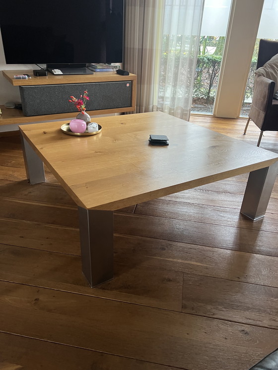 This coffee table by Bert Plantagie combines slender stainless steel legs with a light oak top, creating a modern yet warm look. The minimalist design makes it a versatile addition to any living space, offering both style and functionality.