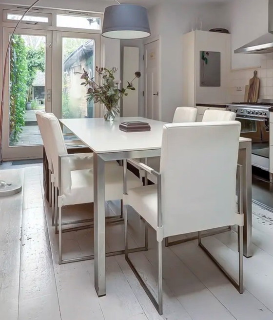 Dutch design by Bert Plantagie 1x (outdoor) dining table white stone with stainless steel legs. Width 100cm x length 220cm x height 76cm (can go for €850)