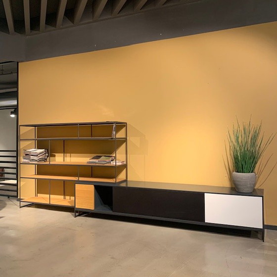 Bert Plantagie Luna TV cabinet + tiered shelf - TV cabinet W240 x D45 x H48 Etagere W175 x D34 x H133 - TV cabinet in satin lacquer RAL 7016 - 1 x Door in oak premium veneer oil - 1 x Door satin lacquer GN.00.88 - 1 x Flap with black speaker fabric - Base Fine structure BP100 Anthracite