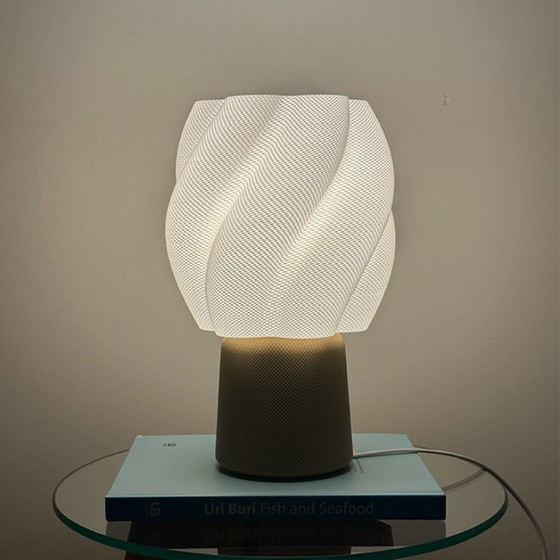 Bertha is a contemporary statement piece that balances architectural precision with a calm, tactile presence. Featuring a softly folded, organic white shade resting on a textured cylindrical base, it is designed as a functional art object for refined interiors.