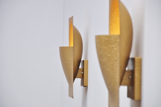 The lamps are crafted from gold-colored brass with a refined, grained texture. They can be mounted with the opening facing up or down, making them versatile, either solo or as a cohesive set. The price is for the two together.