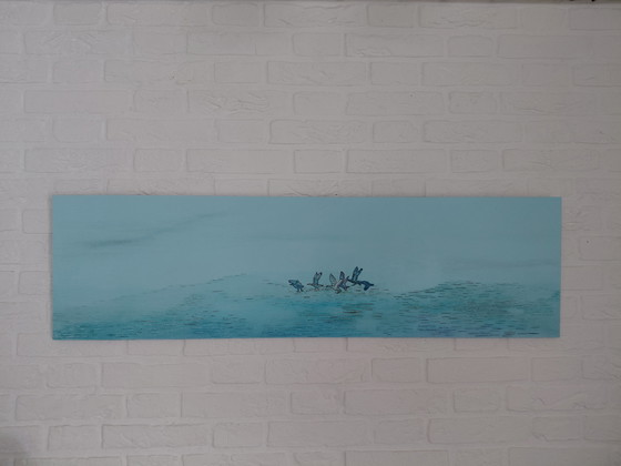 "Between Water and Air" is a unique and mysterious work depicting birds taking flight from the river into the air. The moment of releasing the water and flying back into the sky is a magnificent moment during which birds—especially geese—make a great deal of noise, thereby communicating effectively with one another in their own bird language. This calm and expansive work leaves much to the viewer's imagination. It is wonderful that one can dream away while looking at this work and let one's own imagination run wild.