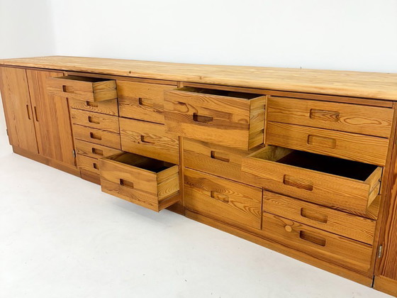 IKEA Uffe sideboard, designed in 1979, features four 80 cm dividable modules, with drawers and doors. Solid wood fronts with recessed handles. A single-piece 320 cm solid wood top. In excellent condition.