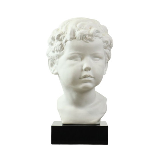 Vintage bust, bust, or sculpture of a young child, made of biscuit porcelain, mounted on a rectangular black granite base, second half of the 20th century, unmarked.