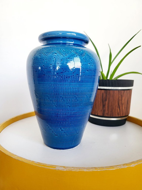 Italian ceramic vase, glazed in blue color tones and decor, designed by Aldo Londi for Bitossi.