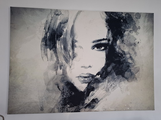 A beautiful, large black-and-white painting of a woman's face. It measures 131 cm by 185 cm. A true eye-catcher, it fits perfectly in a modern interior. The expressive lines and the high-contrast black and white give it a unique look.