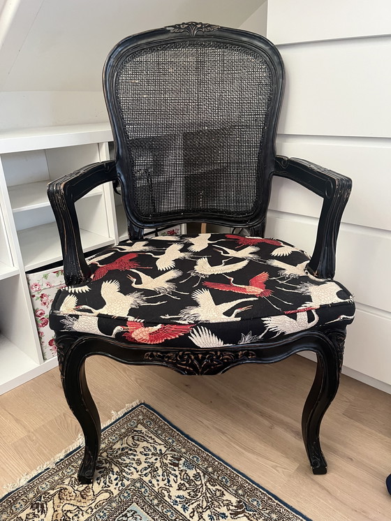 With signs of wear on the black paint, as is typical for a vintage chair. Newly and expertly upholstered with a crane-patterned upholstery fabric.