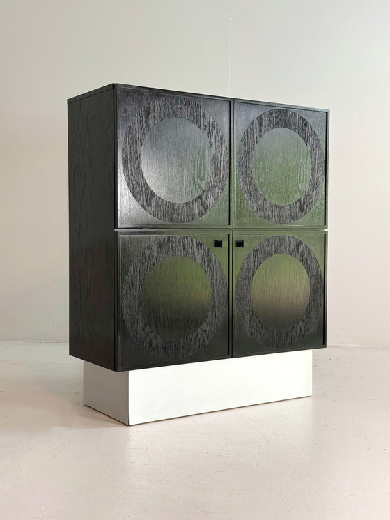 Very nice static bar cabinet in black oak with circular pattern on the doors.