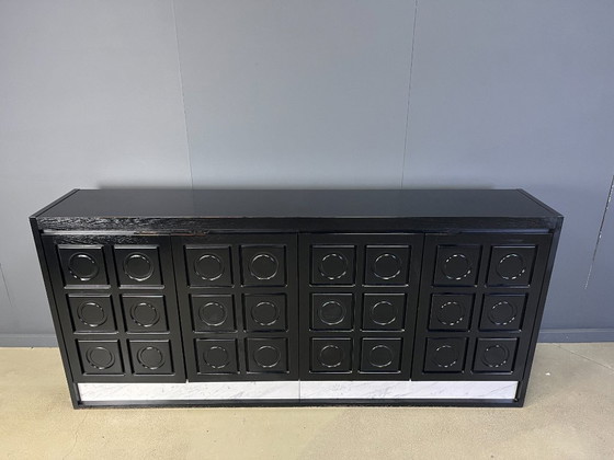 Ebonized black brutalist credenza with 4 doors which offer plenty of storage space.