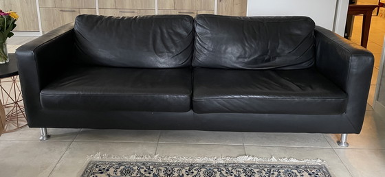 Experience the elegance of modern design with this beautiful black leather three-seater sofa. Its clean lines and luxurious leather upholstery make it a sophisticated addition to any living space. The sofa's minimalist design is complemented by sturdy metal legs, guaranteeing both style and durability.