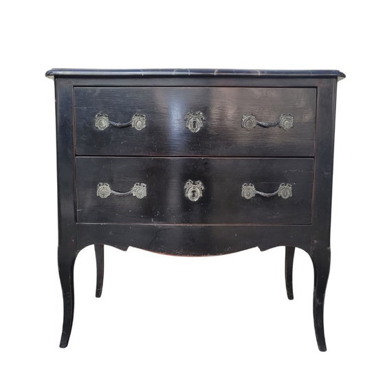 Black Louis XV-style chest of drawers, ebonized wood and marble, Vintage, 20th century – France