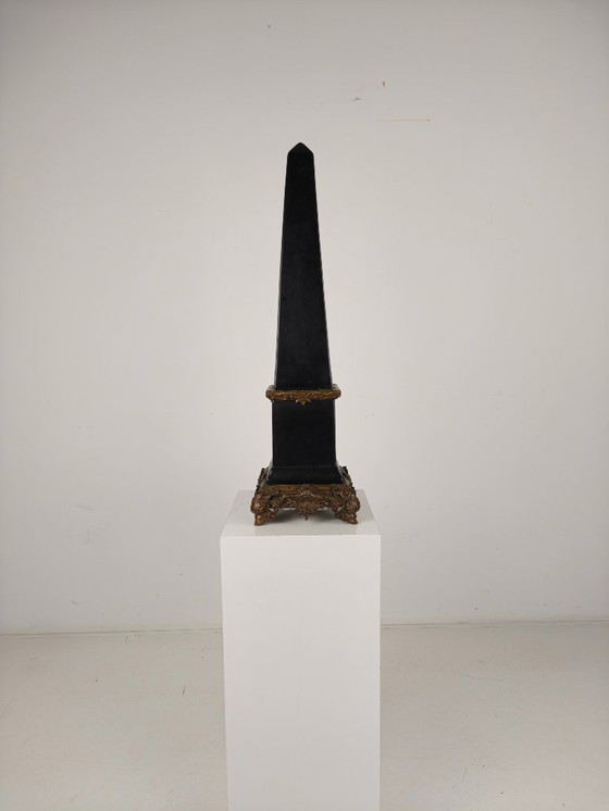 Thanks to its generous size and the refined contrast between the glossy black and the detailed bronze accents, this obelisk is a real eye-catcher—perfect for a mantelpiece, console, or display case.