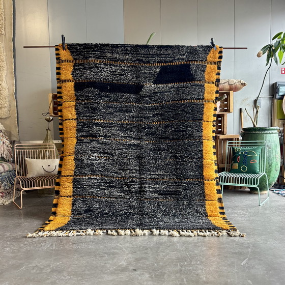 This authentic Moroccan Mrirt wool rug is a true statement piece. Featuring a bold black and grey field with vibrant mustard yellow borders, it blends Berber heritage with modern design flair. Handwoven by skilled artisans from the Mrirt region, this piece brings depth, warmth, and contemporary energy into any interior.