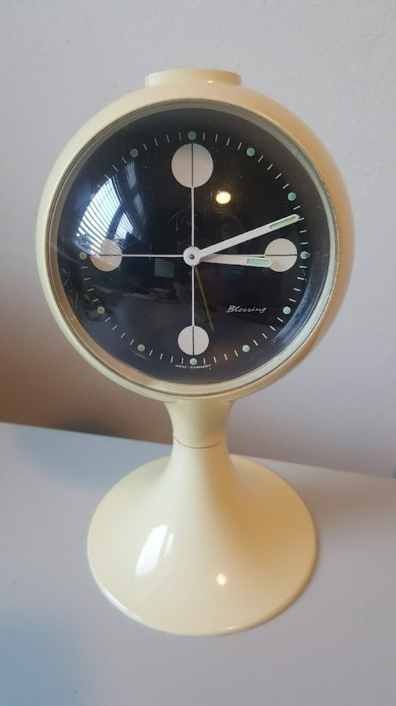 Original Blessing Space Age tulip alarm clock, West Germany, 1970s. It is in excellent and working condition. The plastic has yellowed due to UV, which is inevitable after so many years.