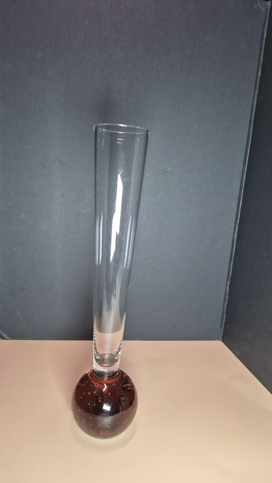 blown glass vase with a solid glass base inlaid with air bubbles. Its slender, refined design makes it ideal for modern, minimalist decor. 🔹 Material: blown glass 🔹 Color: clear with amber base 🔹 Height: 24 cm 🔹 Style: contemporary/modern 🔹 Condition: very good, no cracks or chips This vase is perfect for showcasing a single flower or as a decorative element in its own right. 📦 Fast and careful shipping. 📍 Hand delivery possible depending on location. Don't hesitate to contact me with any questions!