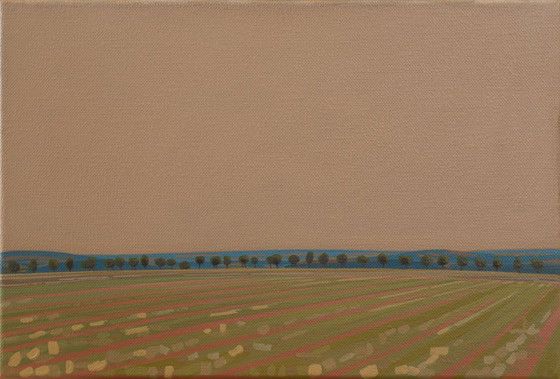 The beautiful avenue with young trees presents itself cheerfully and with striking contrasts against a far-reaching view that reveals the shimmering blue hills and mountains on the horizon. A meditative glimpse into a cheerful and sunny landscape. The painting depicts a typical landscape of the beautiful Eifel region in western Germany. The original painting is signed on the back.