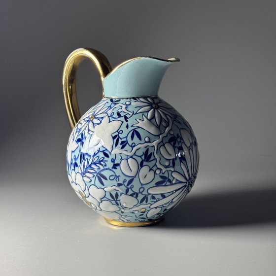 A delightful and highly decorative Art Deco pitcher by Boch Frères Keramis, designed by Raymond Chevalier, showcasing the playful elegance and refined artistry for which his work is admired. With its rounded, almost sculptural globular form, gracefully curved gilt handle and softly flared spout, the piece has a charming, almost whimsical presence.