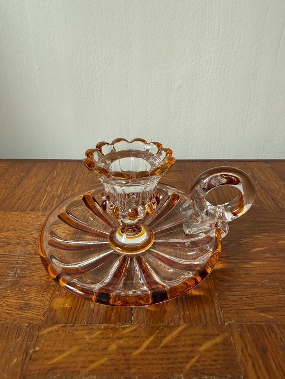 A delicate, almost timeless object. This glass hand candlestick captivates with its warm orange hues and luminous transparency, which gently capture the light.
