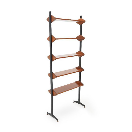 Bookshelf with metal uprights, produced in the 1950s, featuring clean lines and a light yet stable structure.