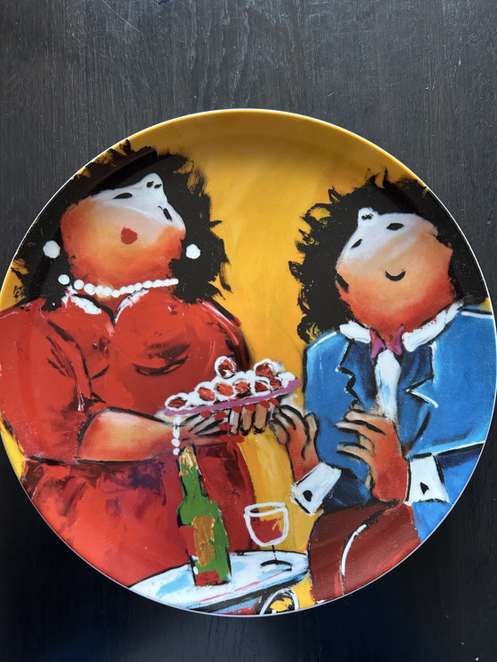 This exquisite large flat plate, crafted by the renowned artist Theo Broeren, is a striking addition to any collection. The vibrant colors and whimsical depiction of figures create a lively and engaging scene, perfect for both display and functional use.