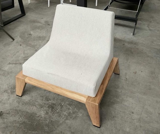Although the condition is unused there are 2 stains in the fabric (see photos) and the teakwood oil has slightly given off at the bottom of the seat cushion. The new price is around €3200, my asking price is €1000