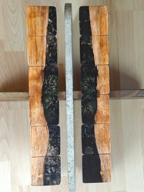 The organic transition between wood and resin follows the natural edge of the material, creating a landscape-like composition across the set. When placed together, the pieces subtly connect visually, forming a quiet dialogue between natural forms and crafted surfaces.