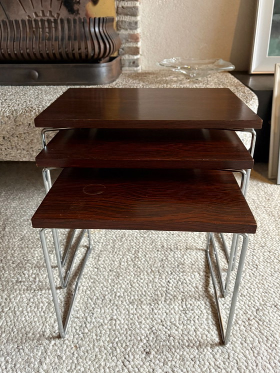 This exquisite Brabantia mimiset from the 1960s embodies the timeless elegance and functionality that defined mid-century design. Perfectly suited for both modern and traditional interiors, this set of nesting tables offers versatility and style in equal measure. Whether used as side tables, coffee tables, or decorative stands, their sleek design and rich wood finish will enhance any room.