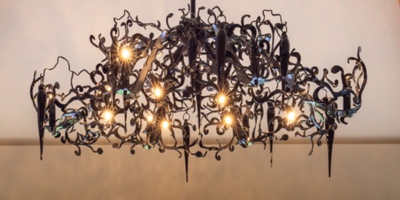 This Brand van Egmond chandelier is crafted from black steel with hand-blown glass pendants. Model FPHO135BL. Purchased in 2006, it is complete and in mint condition. The current retail price is €7,100 excluding VAT. Dimensions: 135x65x45 cm. Includes the original 150 cm suspension rod. There is a dent in the ceiling mount cap due to the shade structure where the lamp was mounted. It has already been disassembled and can be viewed in Amsterdam (city center).